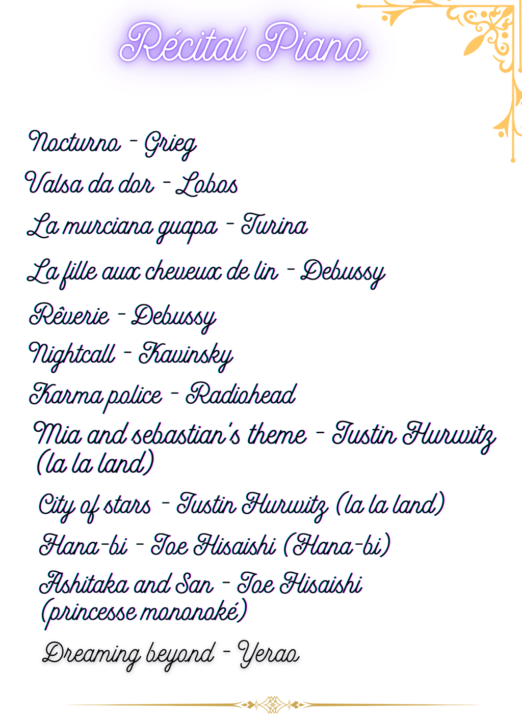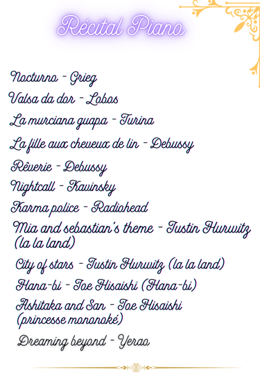 jeune pianiste virtuose de 19 ans, est de retour dans sa région natale et prépare un concert exceptionnel à Saint Martin des Monts 72. En effet, elle participera à la deuxième édition du mini-festival de l'Impasse Festive, Le dimanche 16 juin 2024, elle se produira dans un concert d'une heure environ où elle interprètera des oeuvres de Debussy, Kavinsky, Radiohead,Torina, Justin Hurwitz Joe Hizaishy, Yerao. De plus, elle présentera un volet plus éclectique en incluant des compositions contemporaines en invitant Justin Hurwitz, Yann Creep Radiohead. Ne manquez pas cet événement musical d'exception et rejoignez-nous dès 14h le dimanche 30 juin 2024.